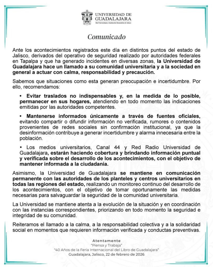 Guadalajara, Jalisco, 22 de febrero de 2026. — Luego de los acontecimientos registrados este sábado y domingo en distintos puntos del estado de Jalisco, derivados de un operativo de seguridad realizado por autoridades federales en el municipio de Talpa, la Universidad de Guadalajara (UdeG) emitió un comunicado en el que hizo un llamado a la calma y a la responsabilidad colectiva.